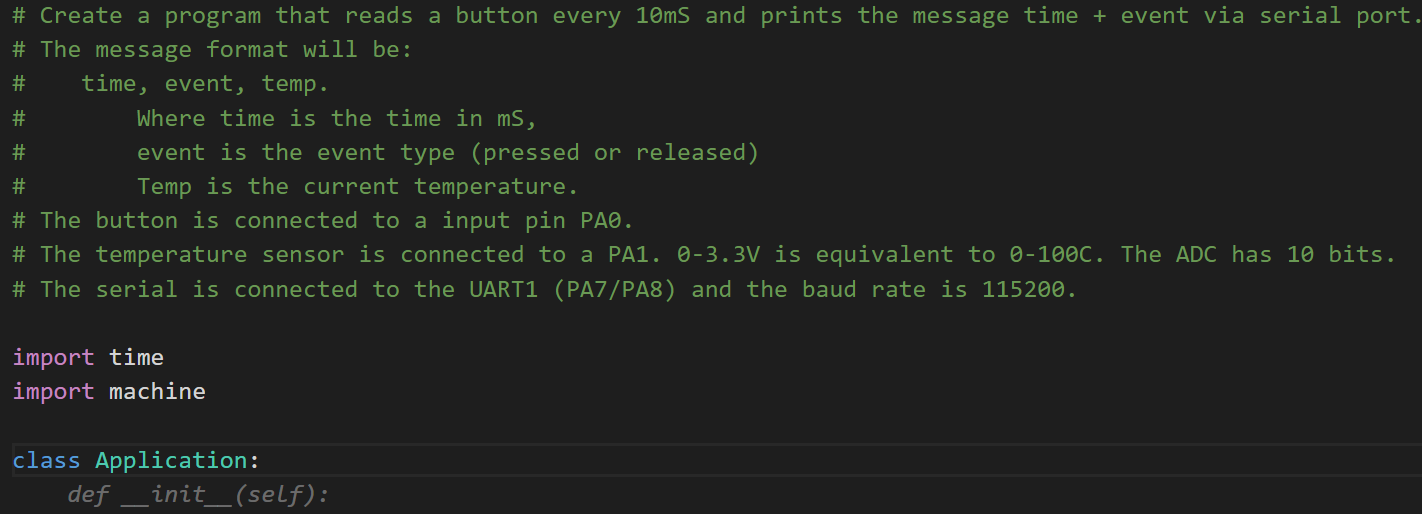 The full hint is displayed in the next cell. Note that it matches the program description very well. The application class makes sense, and even the micropython libraries (PIN, UART, ADC, PIN.irq…) are correctly used. It is not 100% perfect, for example in this case temp_senor is an ADC object, which doesn’t have temp_sensor.init() method, and other small errors can be generated, but the whole structure of the program is definitely correct and the small errors can be fixed easily.