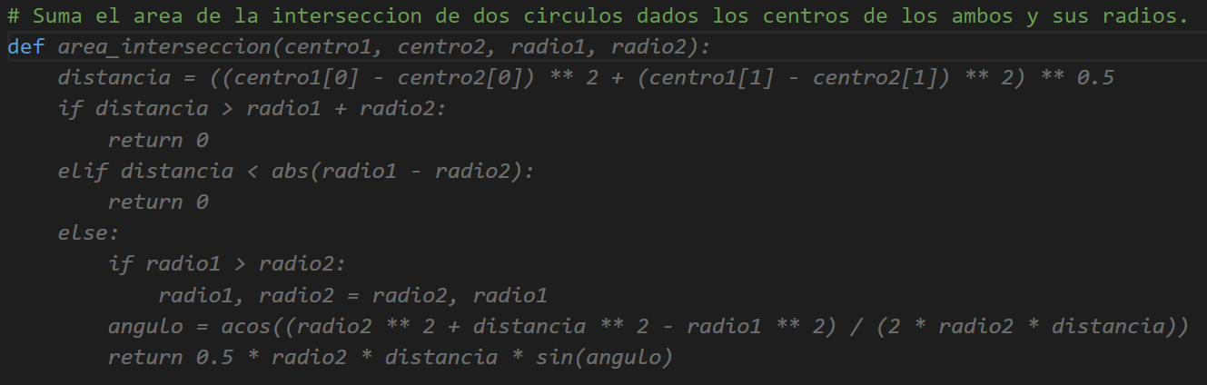 In this example, we ask (in Spanish) to sum the area of intersection of two circles given its center and radius. Copilot understands the Spanish text without problems and suggests the function name, the parameters and all the function body. After a short review it looks like the code should work.