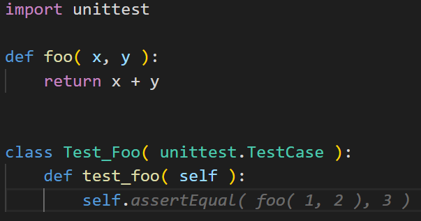 In this example, we use the unittest python module, and Copilot knows that the unittest.TestCase has a method named assertEqual and also knows that foo( 1, 2 ) should be 3.