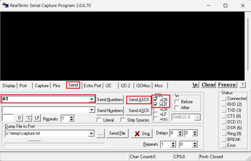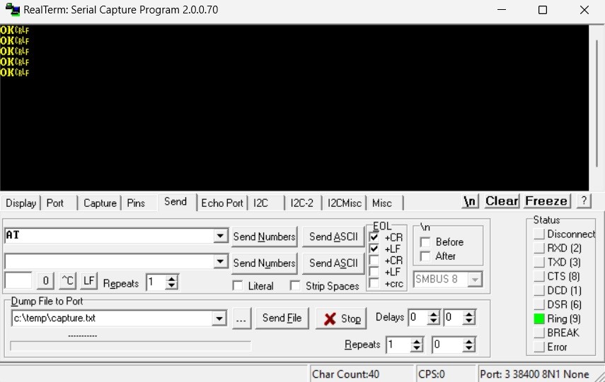 1. To make sure everything is correct, you can send this string : click Send, type AT, at EOL chose +CR and +LF, then click SendASCII.