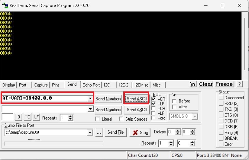 1. Open RealTerm, Click on Port, set Baud to 38400. And at Port, type in the COM number which can see in your Device Manager, in our case it will be 15.
