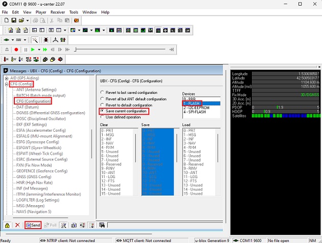 - If we want the receiver to start logging right after power-up, we need to store this configuration in the permanent flash memory. Go to UBX–>CFG–>CFG and Save current configuration in FLASH and press Send.