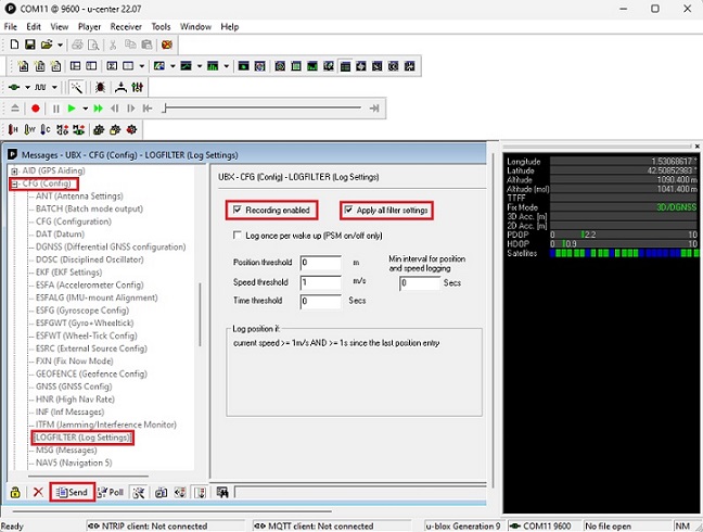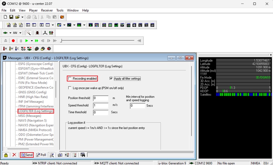 - To access the log, the first thing we need to do, is to stop logfile feature. This can be done going again to UBX–>CFG–>LOGFILTER, unselecting Recording Enabled, and click Send.