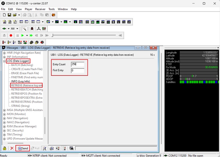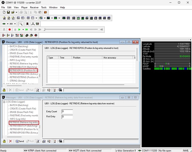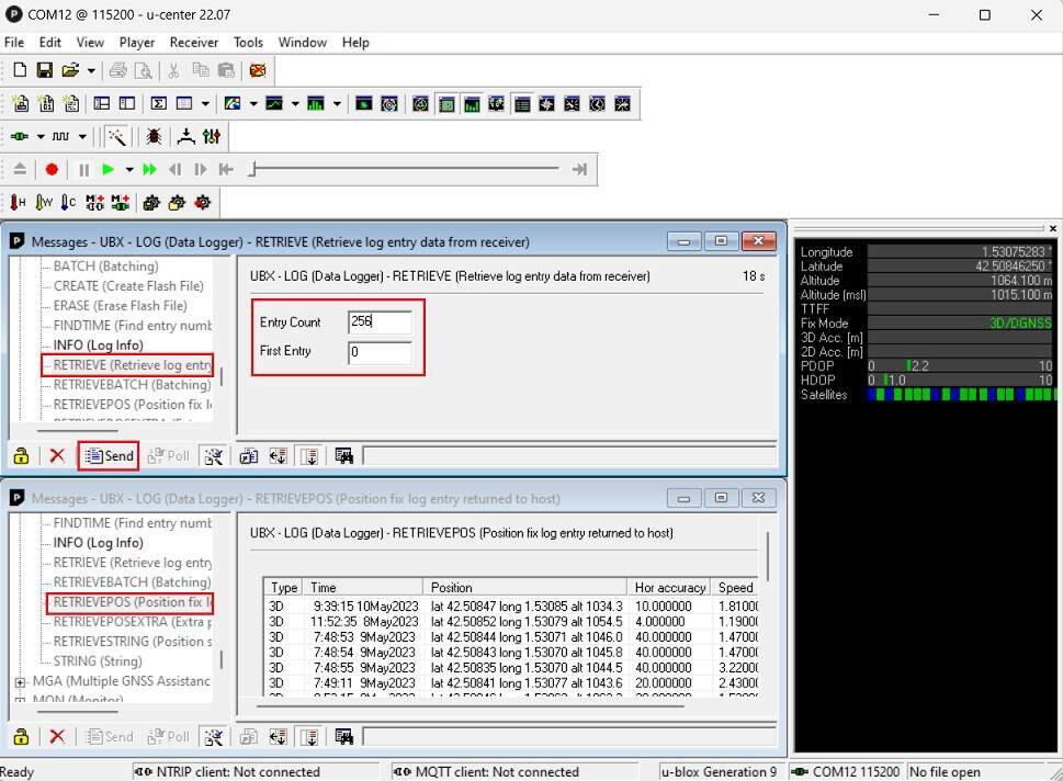 - We recommend to open 2 Message View windows: one with UBX–>LOG–> RETRIEVE and another one with UBX–>LOG–>RETRIEVEPOS. A big limitation of the log browser is that you can only retrieve 256 positions at a time.