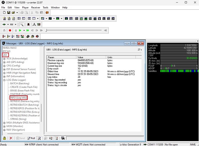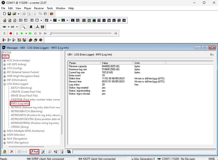 - Go to UBX–>LOG–>INFO and press Poll. This message will give us information about the available memory, data stored, recording enabled/disabled. It’s just for your information, we will come to this message later.