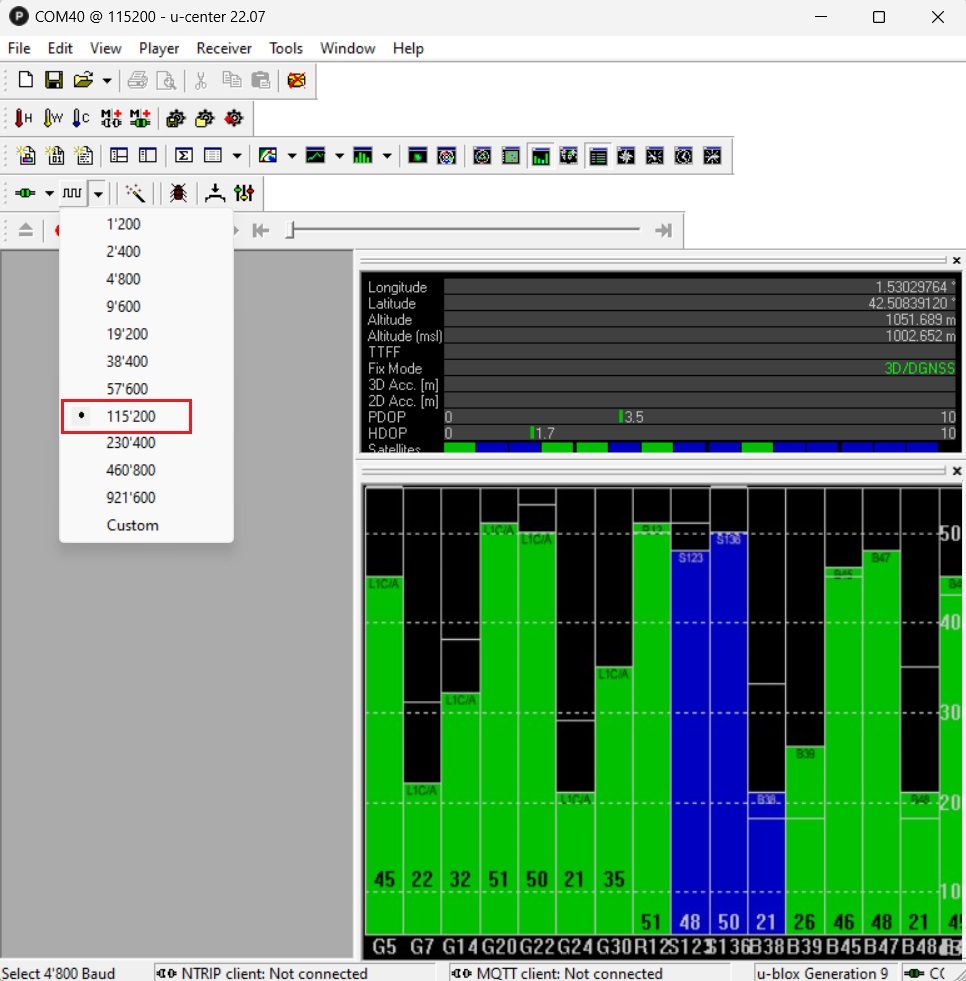 - Connect your Base receiver with u-center. Set baudrate to 115’200. You will see the position of your rover.