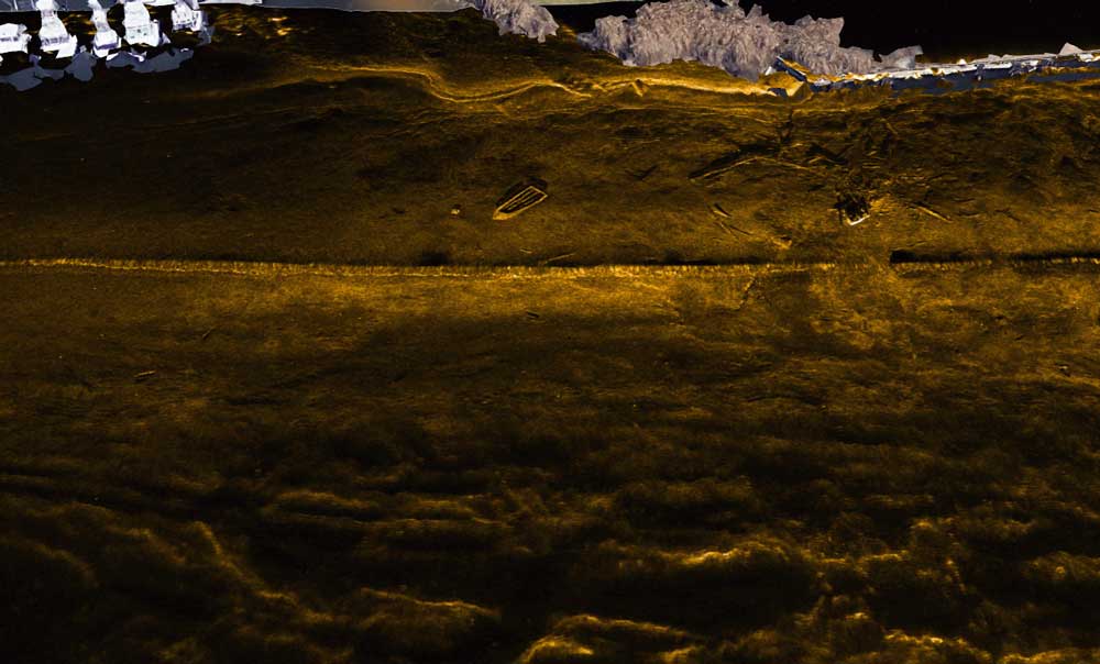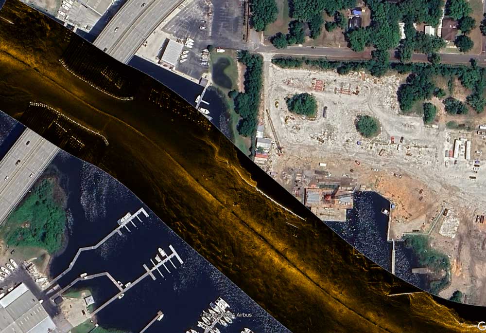 The survey results display detailed underwater imagery collected during a marina survey. Key features include a sunken boat, bridge pilings, and other underwater structures, clearly visualized thanks to the precise RTK GPS positioning and real-time processing with SonarWiz software. These images highlight the system’s ability to deliver high-quality, professional-grade sonar survey data, ideal for showcasing its capabilities in marketing or technical demonstrations.