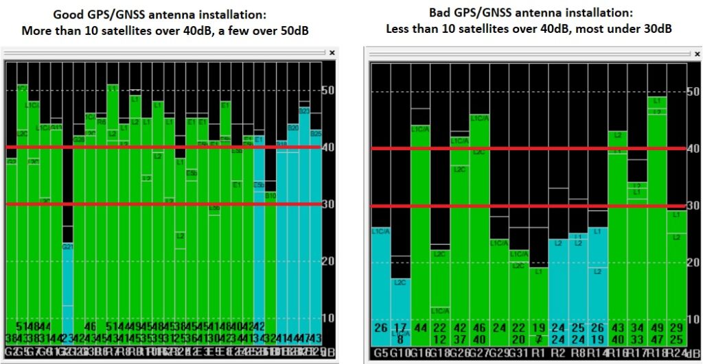 1. Low satellite signal strenght is the most common problem in RTK systems. If you don’t have the minimum signal strenght, it’s simply not possible to calculate centimeter level position. Use the following diagram as a reference to compare with your own antenna installation.