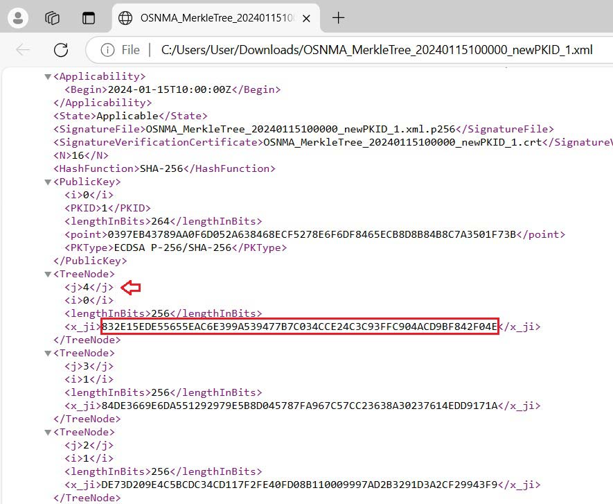 - Open the Merkle Tree “.xml” file in a browser by right click and Open with. We’ll need to find the “x_ji” parameter of “TreeNode j4” (highlighted below).