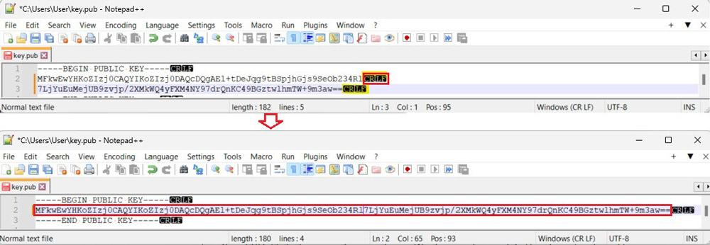- Please note that there will be a CRLF (carriage return and line feed) between the first and second lines of the key. Be sure to remove this extra space, otherwise, you may encounter an error message when using the key.