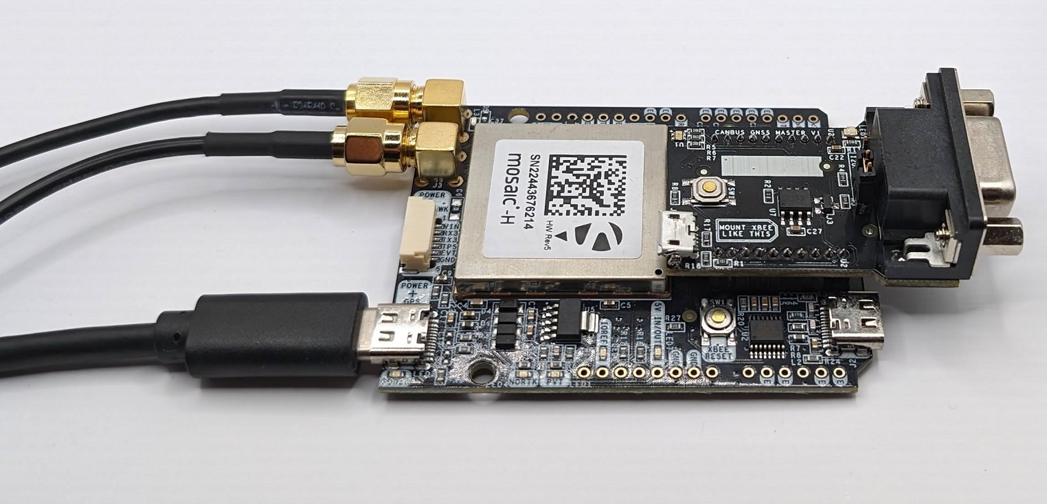 We will start by connecting the different items as in the picture below. Just be careful when plugging the CANBus GNSS Master, making sure you connect the pins without bending them.