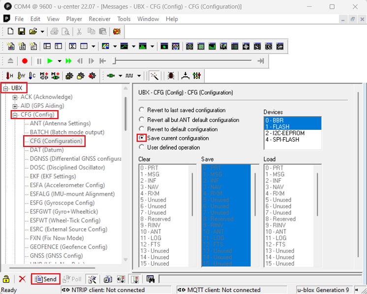 Go to UBX–>CFG–>CFG. Choose Save current configuration and press Send.