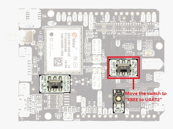 - Make sure the switch under the XBee socket is moved to “XBEE TO UART2”.