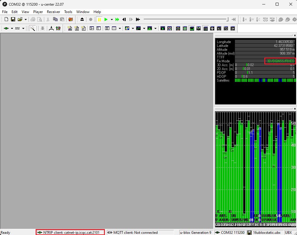 - In a few minutes, you will see the Fix Mode change to FIXED or FLOAT. At the bottom of the screen the NTRIP client icon will turn green. With valid FIXED you should see the 3D Acc.(accuracy) and 2D Acc. are centimeter-level.