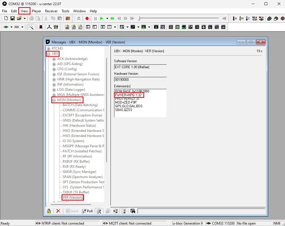 - You can check the firmware version of your receiver by going to View–>Message View–>UBX–>MON–>VER.