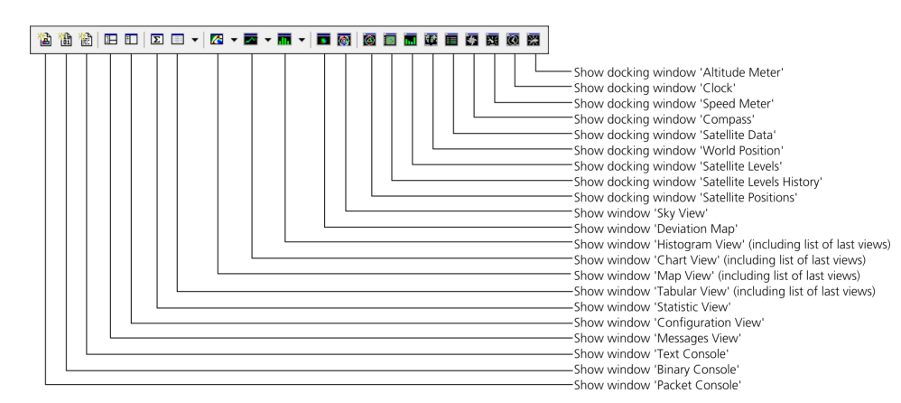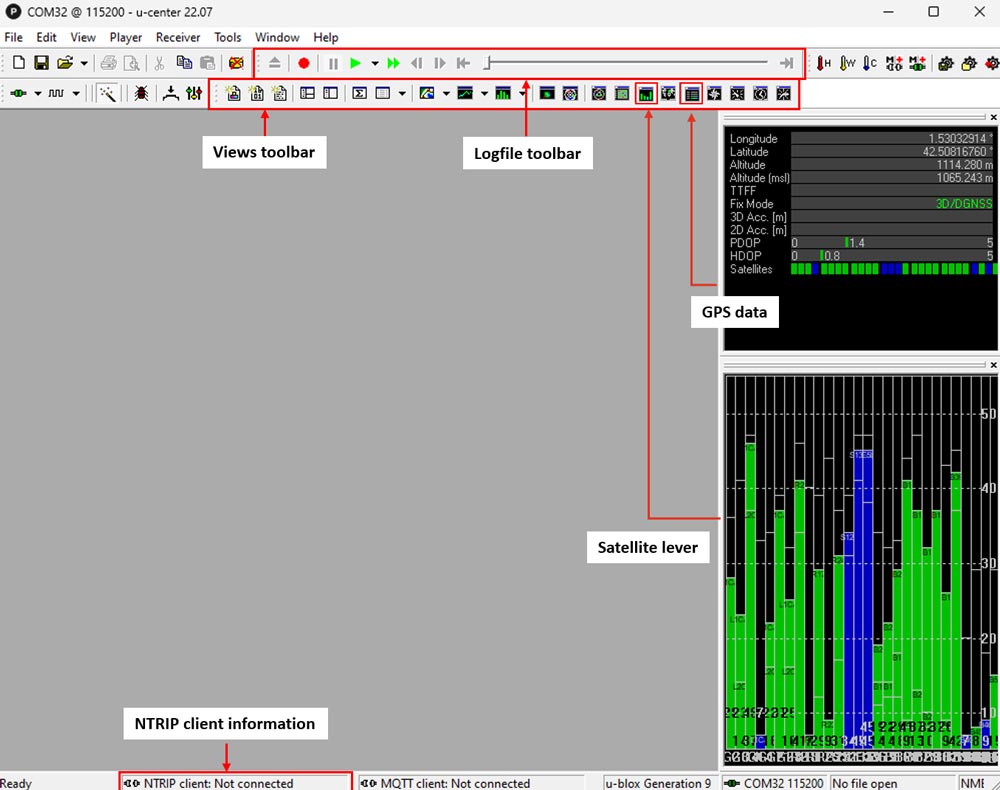 - In the views toolbar, you can choose the data you want to visualize. We recommend enabling GPS data and satellite levels by clicking the icons highlighted in the red squares to view the coordinates and signal strength. You can arrange the location or toolbar by clicking and dragging with the mouse. Additionally, you can change the position and size of the docking window using the mouse.