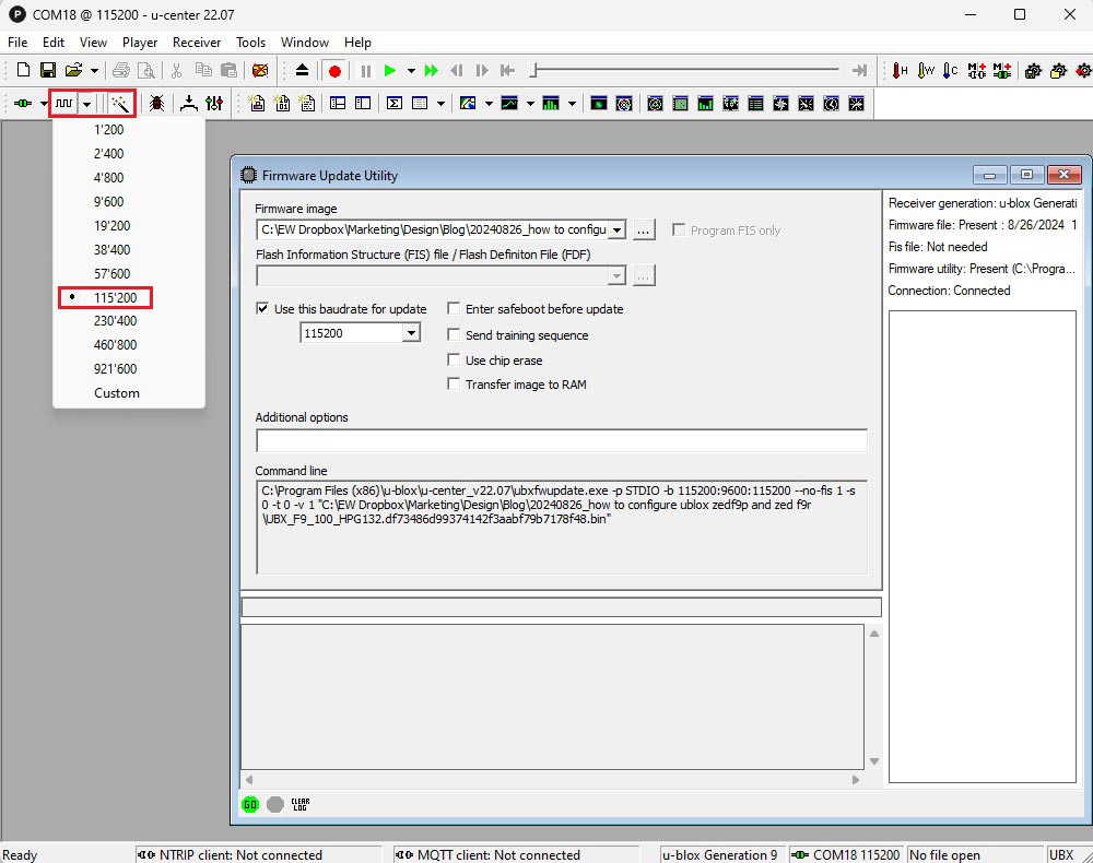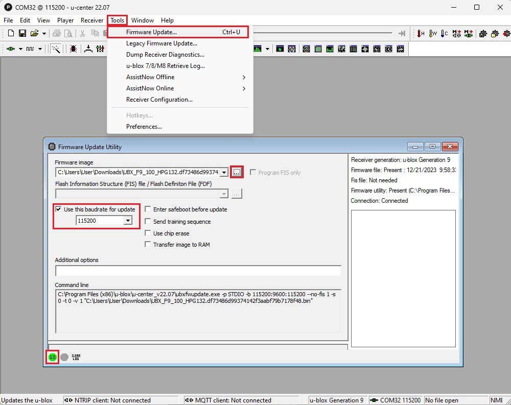 - Go to Tools–>Firmware Update…Make sure to select the options as shown in image below. (With simpleRTK2B Lite, the maximum baudrate is 115’200bps. So setting baudrate to 115200 will work for all our simpleRTK2B series boards).