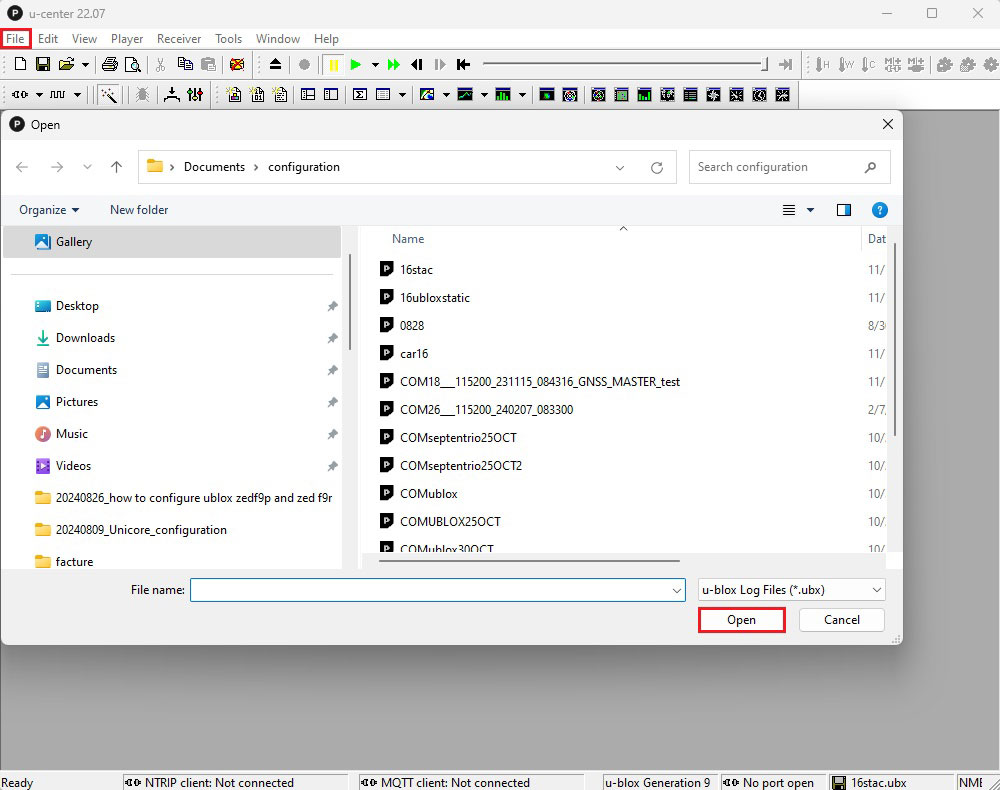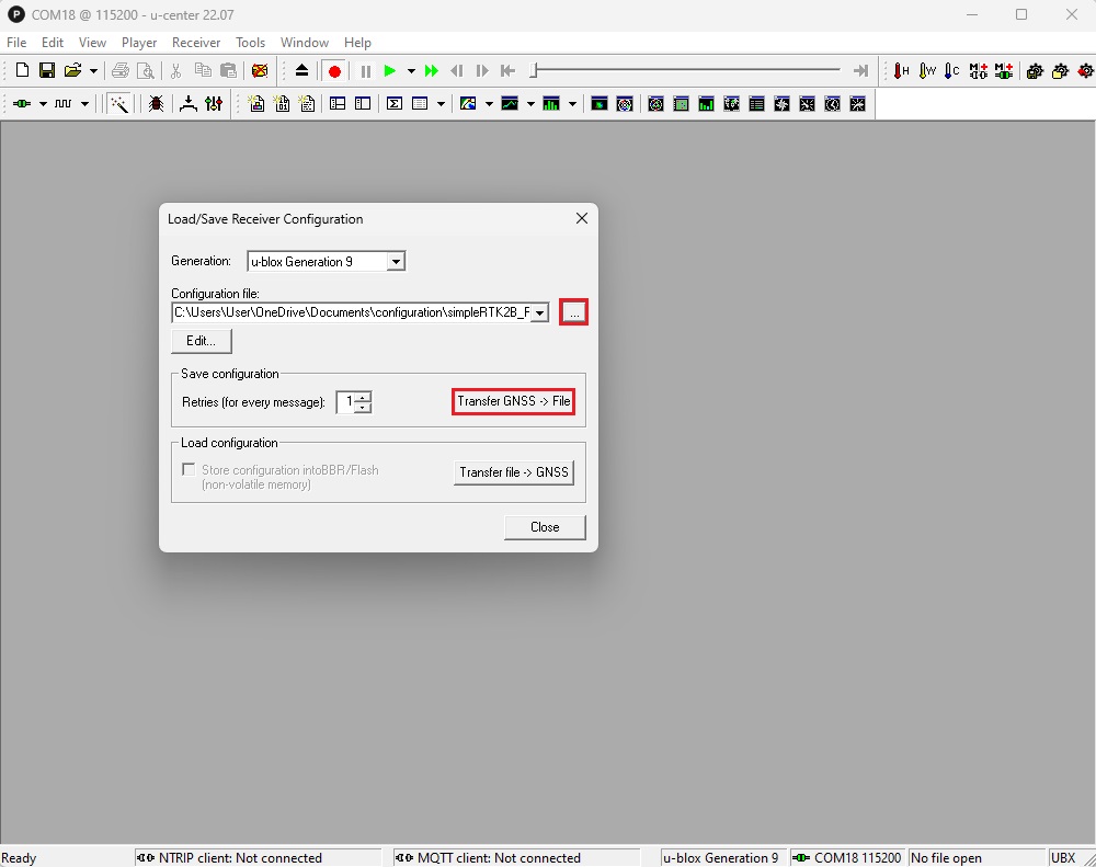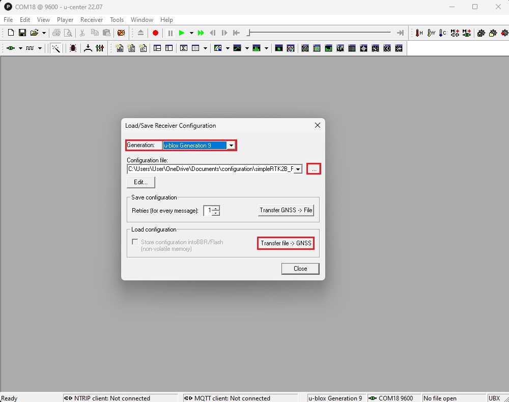 - At menu bar go to Tools–>Receiver Configuration…Select Generation u-blox Generation 9.Select the configuration file from your hard disk.Click Transfer file–>GNSS. NOTE for simpleRTK2B Lite users: when loading configuration files to simpleRTK2B Lite board, you are using UART1 (via USB with a UART-to-USB converter). The configuration files might change the baudrate you have on your board, leading to a loss of communication in the middle of the configuration file update. When this happens, just change the baudrate of u-center and load again the configuration file at the new baudrate.