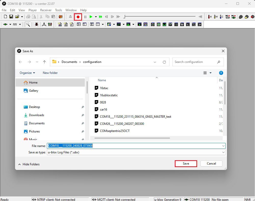 - Click the record button in the toolbar, then select the folder and filename where you want to save the logfile. Click Save.