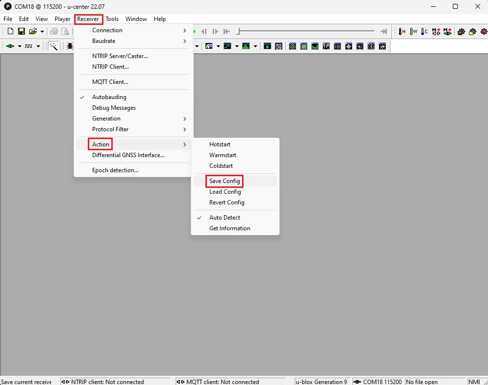 - When finished configuration, the simpleRTK2B will start using the new configuration immediately. But if you remove the power, it will revert back to the previous one.To permanently store our new configuration, in the menu bar, go to Receiver–>Action–>Save Config to save your configuration.