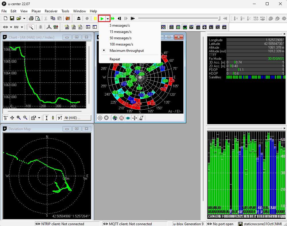 | Rover 10Hz | FW 1.51 doesn't support 10Hz update rate | File | Starting from a default ZED-F9P configuration: Change UART2 baudrate to 115kbps. This improves the buffer use of the radio links. Disable SBAS, to avoid position jumps during short RTK corrections interruptions. Disable Beidou, to make it simpler to increase navigation rate to 10Hz without troubles. Disable GSV on UART to avoid buffer overflw Change navigation rate to 100ms |
