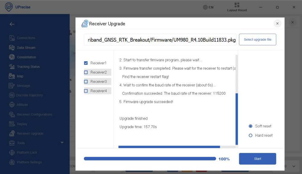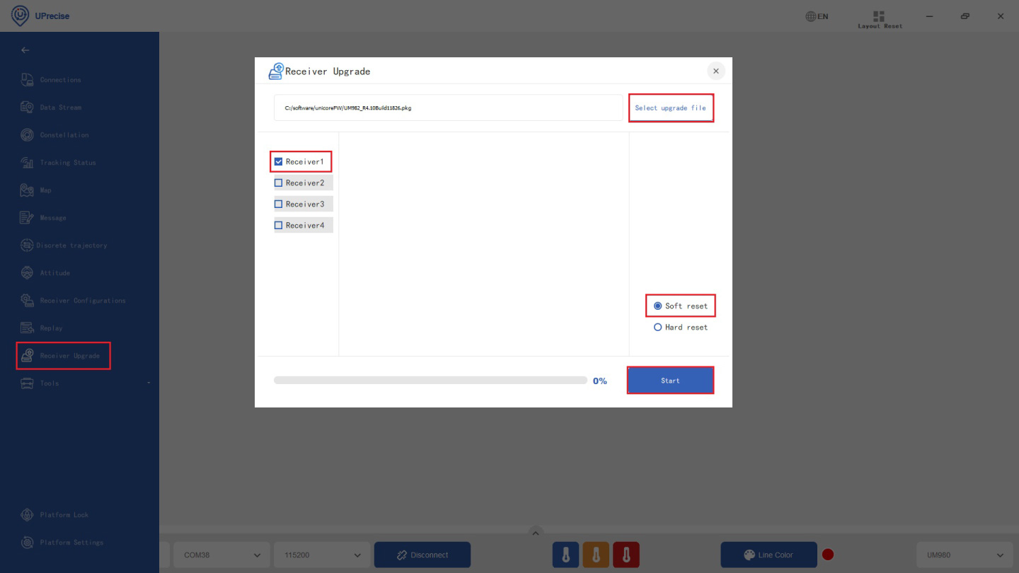 - Go to Receiver Upgrade. Select the upgrade file you download in step 35. Check the Receiver connected. Choose Soft reset. Click Start.