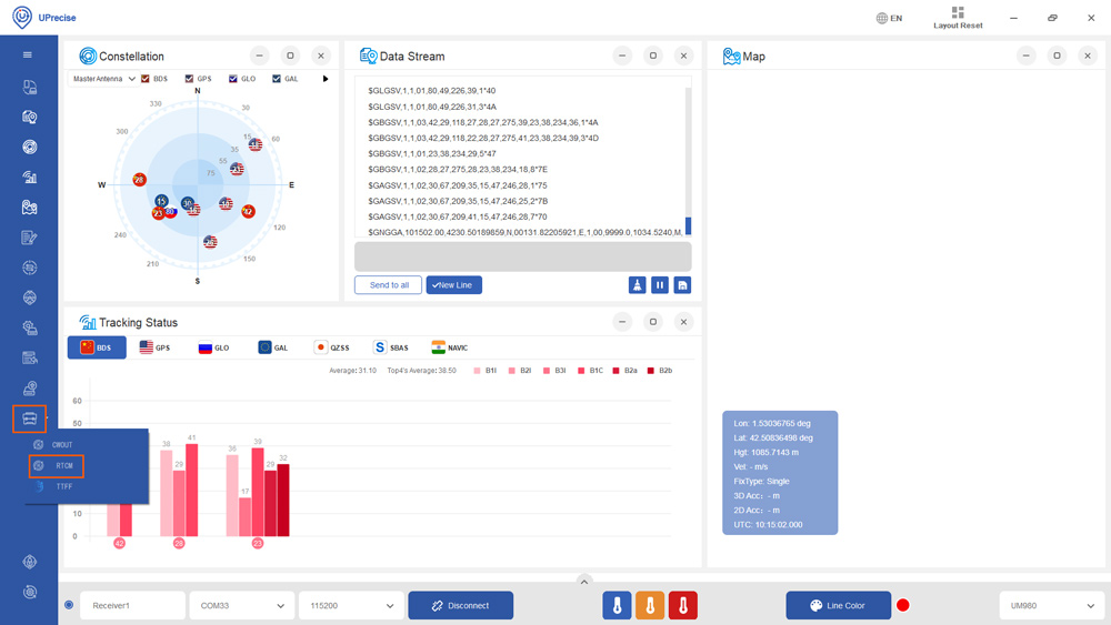- Click the toolbox icon and select RTCM.