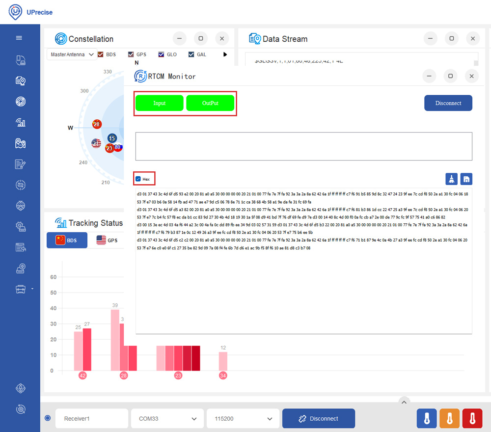 - You will see the Input and OutPut change into green. Check Hex, you will see the RTCM messages from the server.