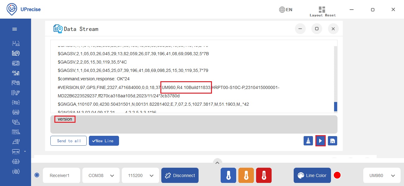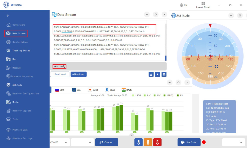 - At Data Stream you can see the UNIHEADING Message. Don’t forget to type saveconfig and press Enter to save your configuration.