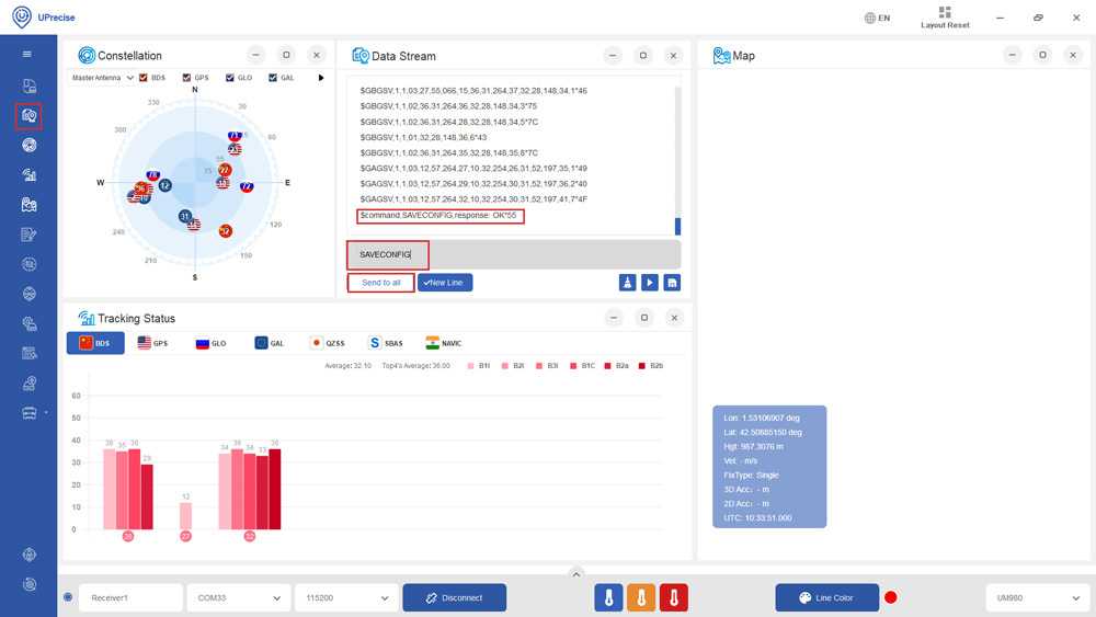 - At Menu bar choose the Data Stream icon. At Data Stream window type in SAVECONFIG and press Enter. On the Data Stream you will see Command, SAVECONFIG, response: OK. It means your configuration is saved to the Flash of your receiver.