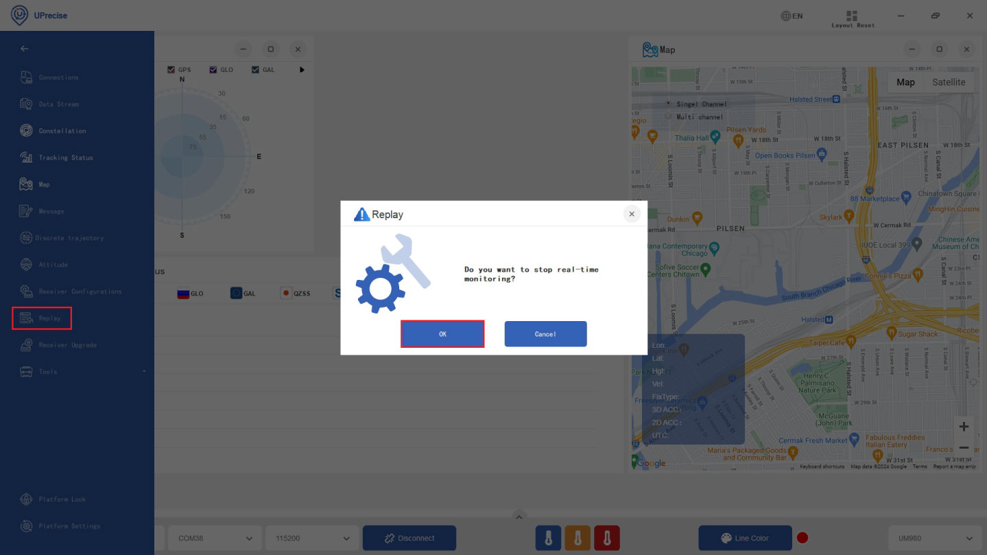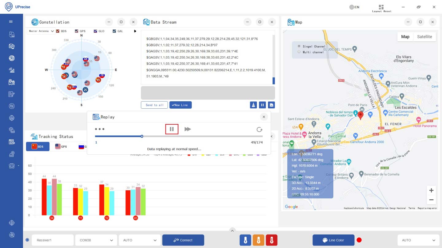 - Click the icon play. During the replay, UPrecise displays the satellites in view, positioning information, parsed messages, satellite distribution etc.