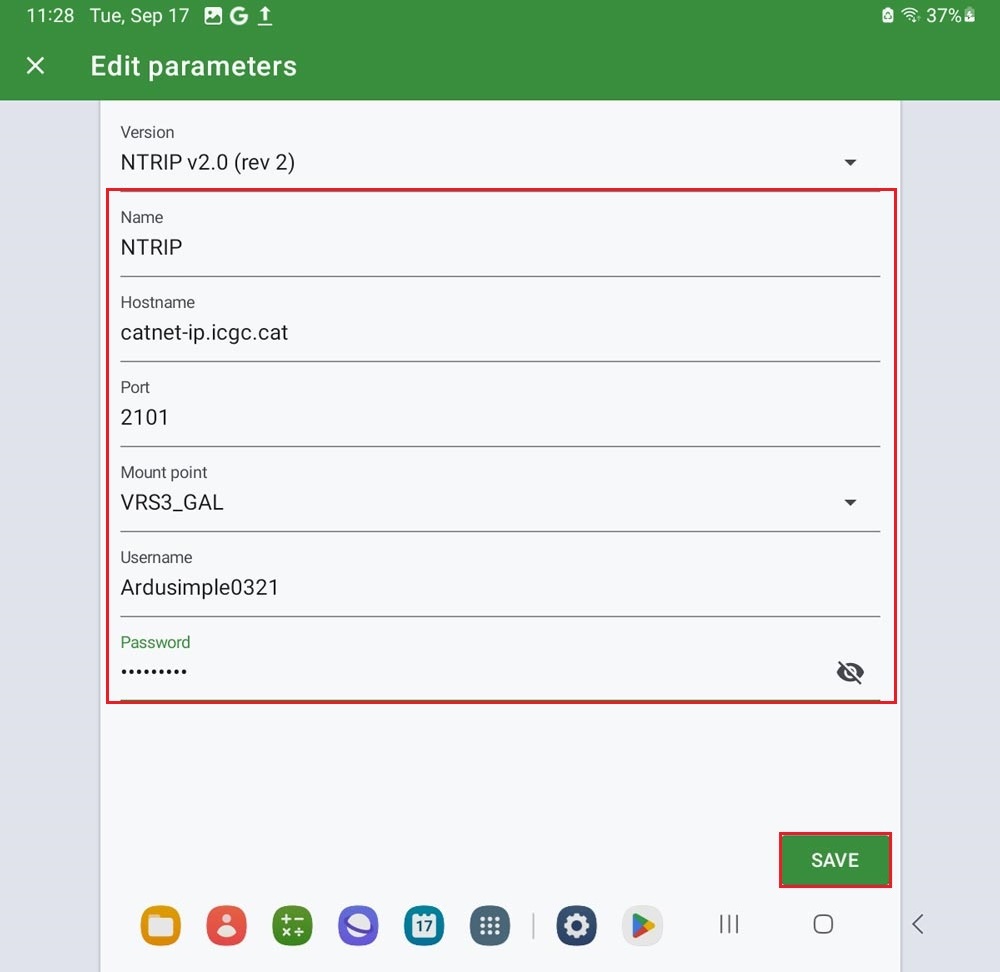 - Enter the credentials of your NTRIP client (Hostname, Port, Mount point, Username and Password). Tap SAVE.