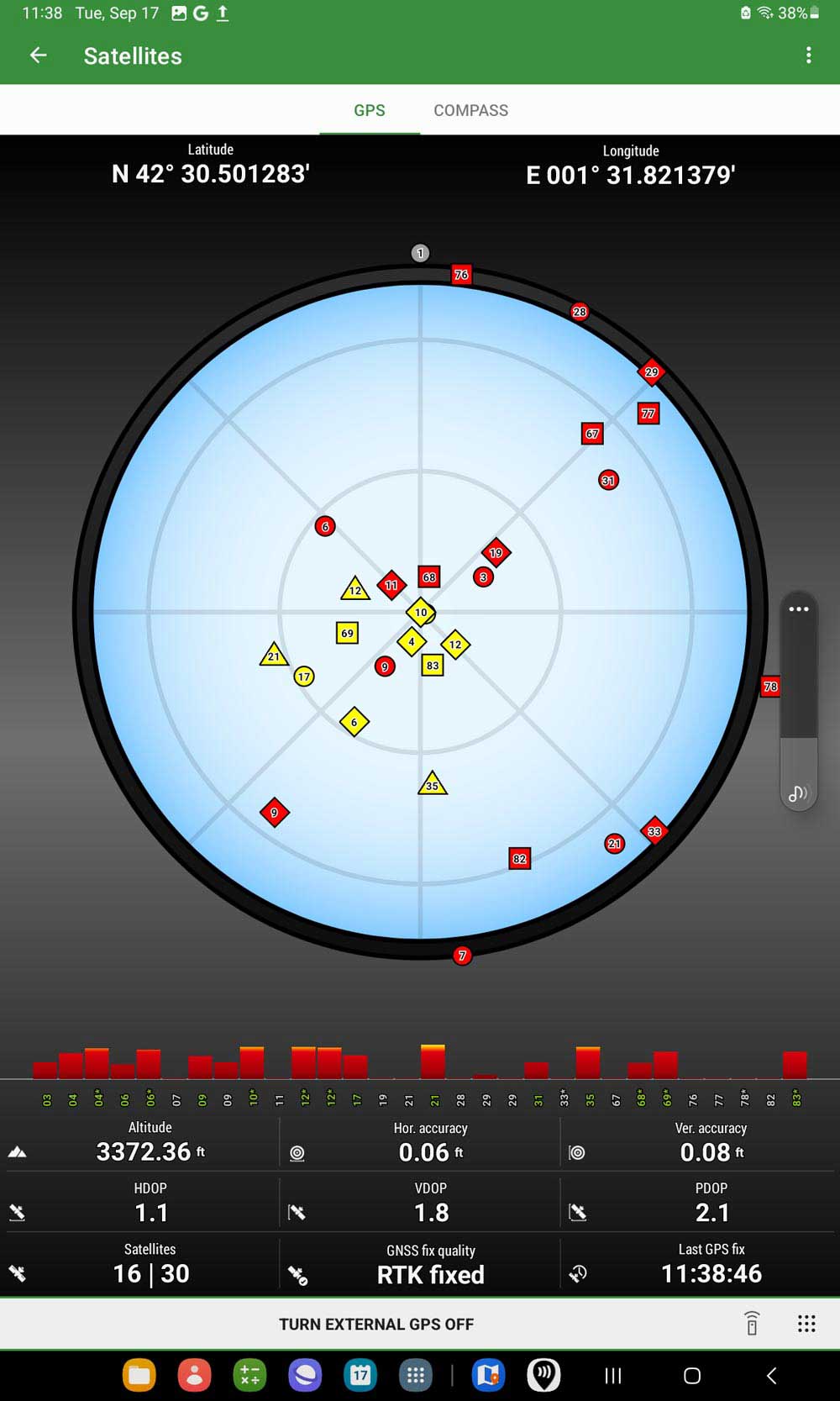 - Tap the satellite icon, you can see the satellites information and location information with GNSS fix type float or fixed.
