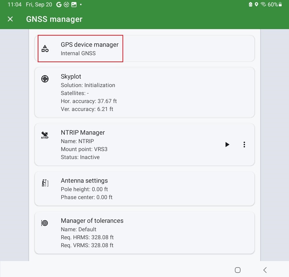 - Open Locus GIS. At menu, go to GNSS manager.