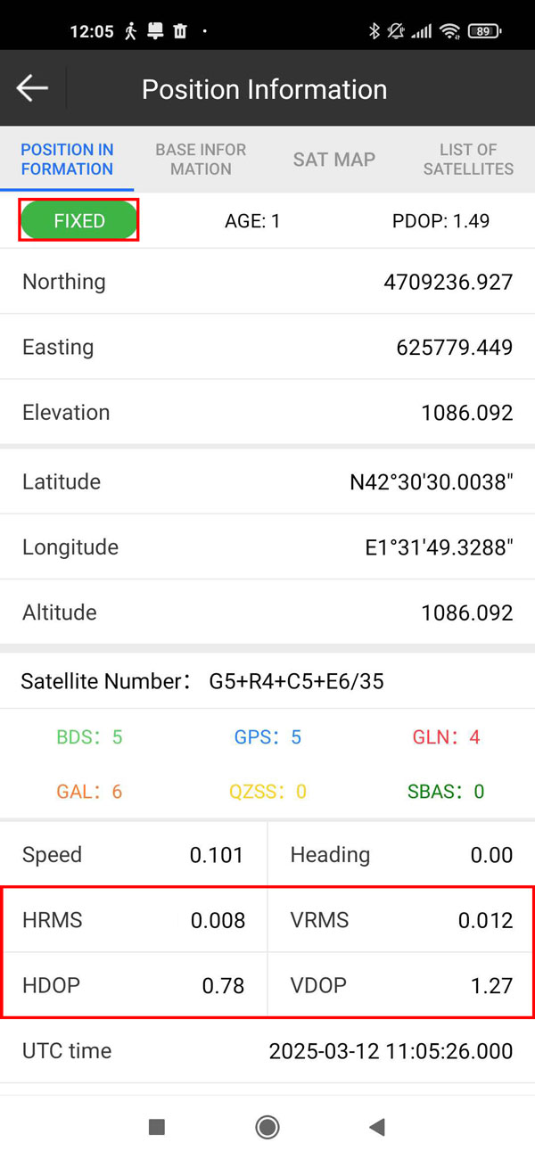 HRMS is the Horizontal Root Mean Square. VRMS is the Vertical Root Mean Square. With a high-quality RTK FIXED solution, accuracy will reach centimeter level. Additionally, HDOP (Horizontal Dilution of Precision) should remain below 1 for optimal performance.