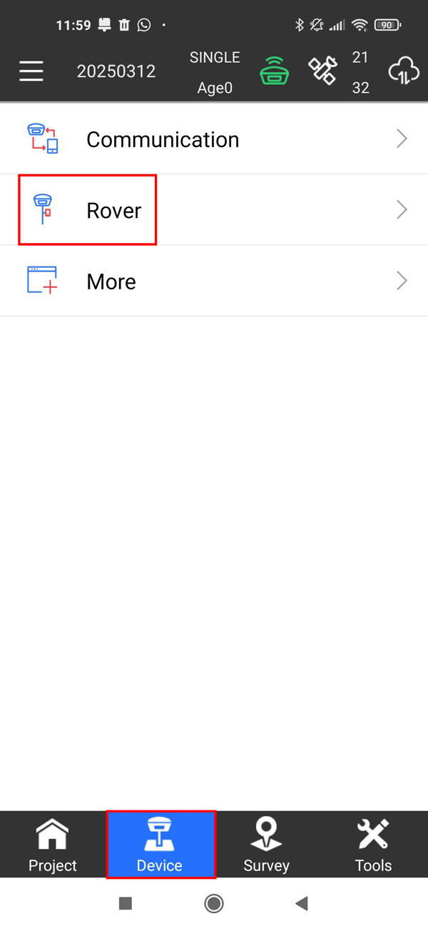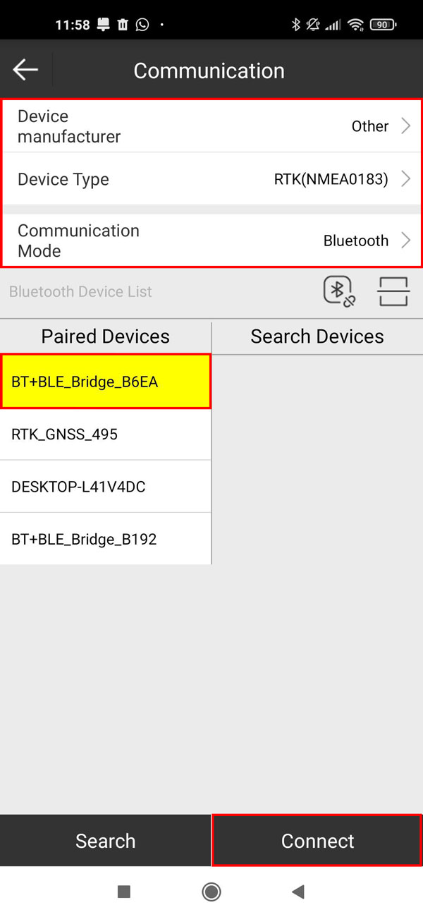 - At Device manufacturer choose Other, Device Type choose RTK(NMEA0183), Communication Mode choose Bluetooth.