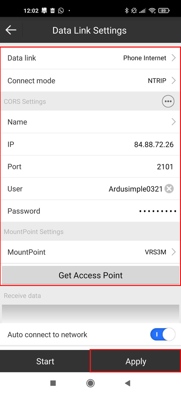 Fill in the NTRIP credentials (IP, Port, Mount point, Username and Password). Tap APPLY.