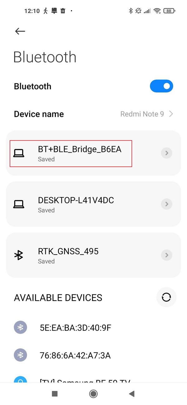 - Open Bluetooth settings on your Android device, search for your RTK kit which name will be BT+BLE_Bridge_XXXX. Tap Pair. Note: This only need to be done once.