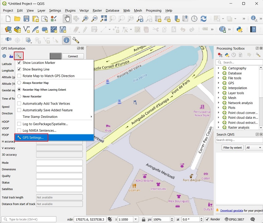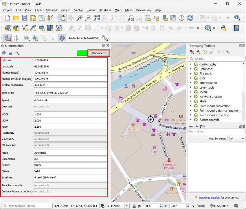 - You will see GPS information on the panel. You can now track the position with your preferred map Plugins or layers imported from other applications.