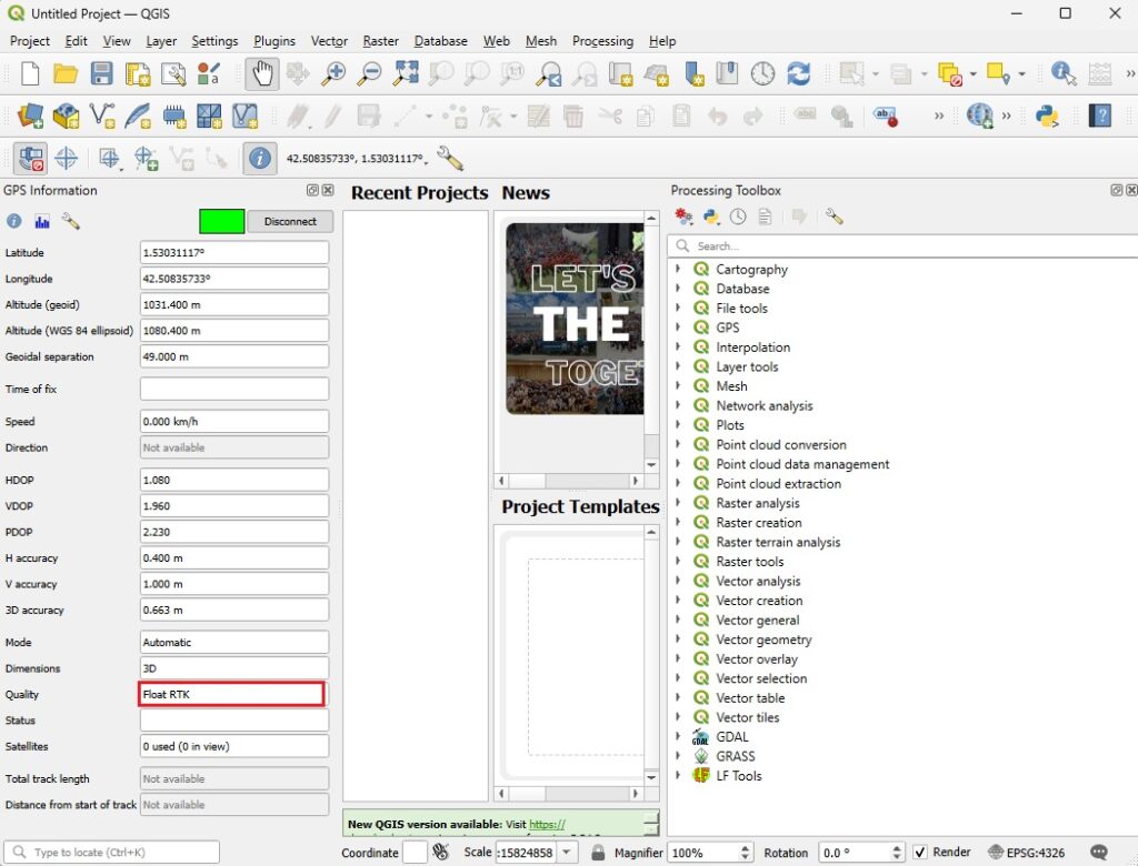 - Go back to QGIS. Connect your receiver via the Virtual serial port. Now you should see Quality change to Float or Fix RTK.