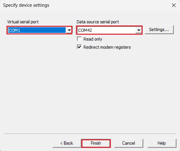 - At Data source serial port choose the COM port of your receiver. At Virtual serial port choose a number that is not in use. Press Finish.