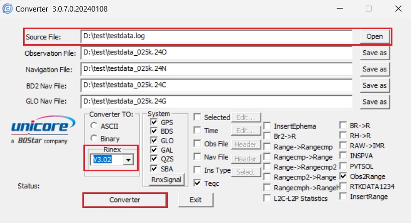 - Open the ConverterTool. At Source File choose the log file you saved in step 8.At Rinex choose V3.02. Click Converter.
