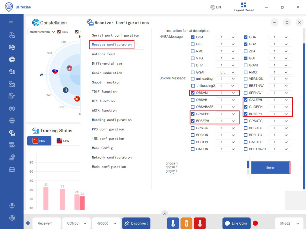 - Click the Receiver Configurations icon. Choose Serial port configuration. Set COM1 Baudrate to 460800. Click Enter.