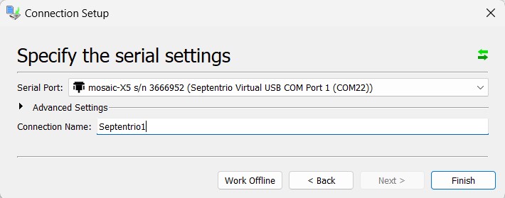 - Connect your receiver to RxLogger via Serial Port. Choose the COM port of your Septentio receiver and type in a connection name. Press Finish.