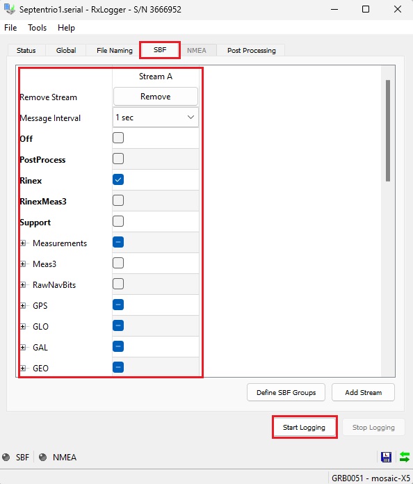 - Go to SBF. Enable SBF data output and logging as in the following picture: