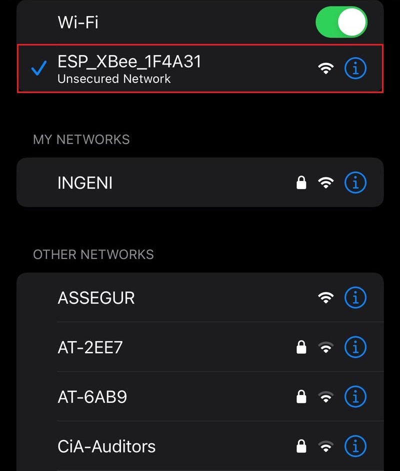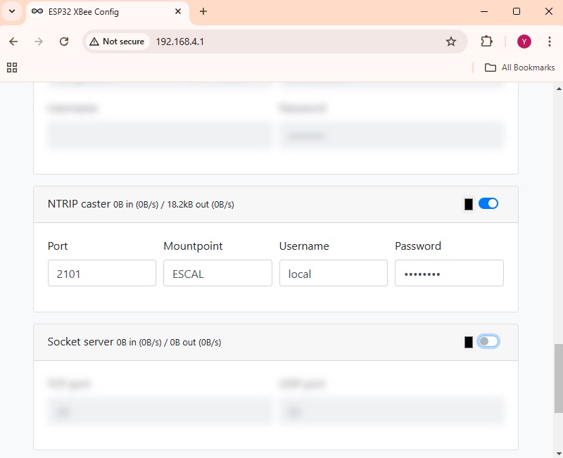 - Once powered, the WiFi NTRIP Master will create its own WiFi network called ESP_XBee_xxxxxx, where xxxxxx are some random numbers/letters unique to your device. Simply connect to this network using your smartphone or PC, then open your web browser and enter the following address: http://192.168.4.1/