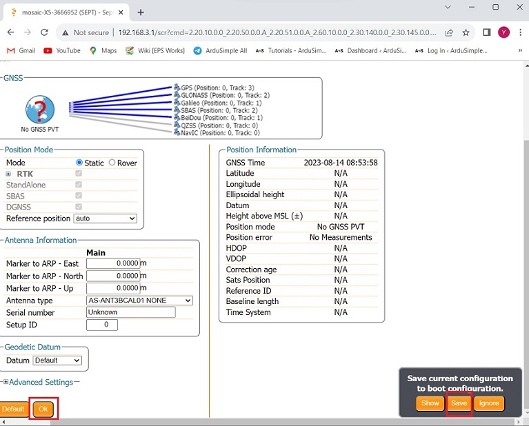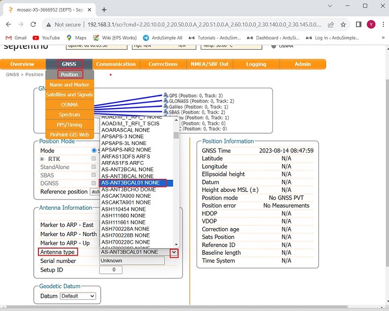 - Go to GNSS –> Position –> Antenna Information –> Antenna type. Select your ArduSimple antenna (AS-ANT3BCAL01 NONE).