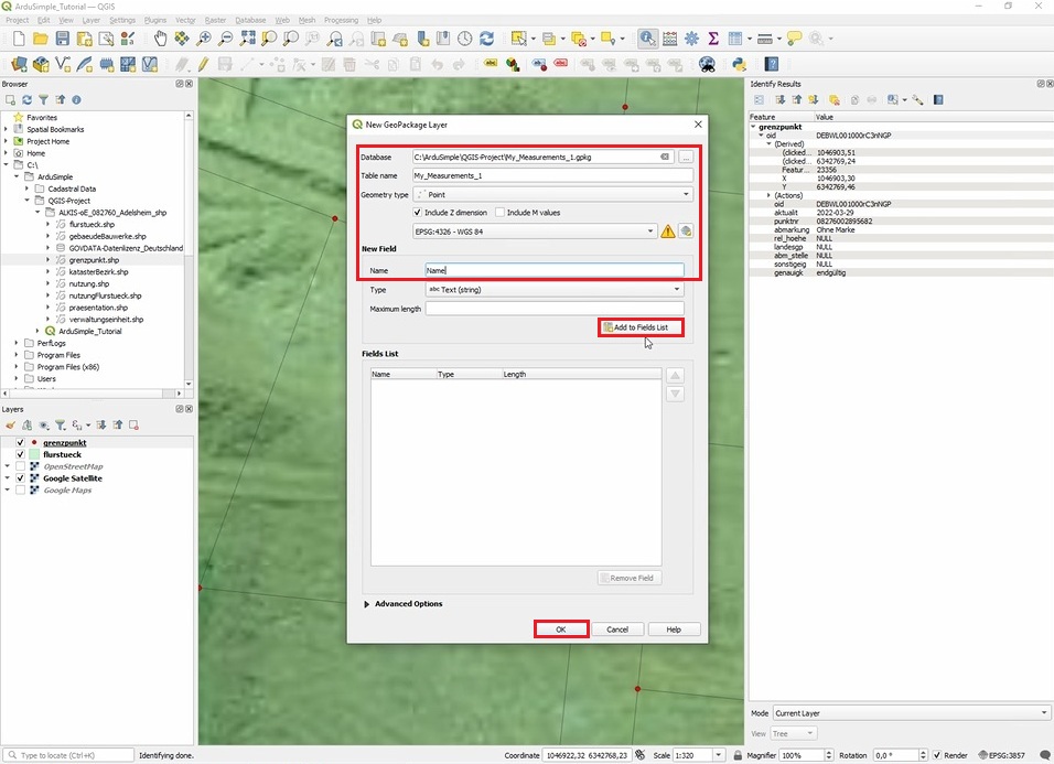 1.  Set the Database filename and location (store it within your QGIS project folder) and set a Table name. Set the Geometry type to Point. Check Include Z dimension to store altitude and (this step is important because otherwise QGIS will not be able to store altitude information of your measurements). If you want you can add a New Field which will be shown and can be edited when you create a measurement. Click OK to close the window. The new layer will appear in the Layers pane.