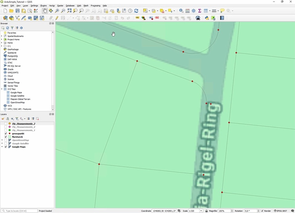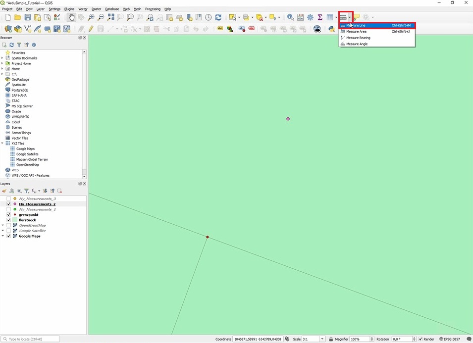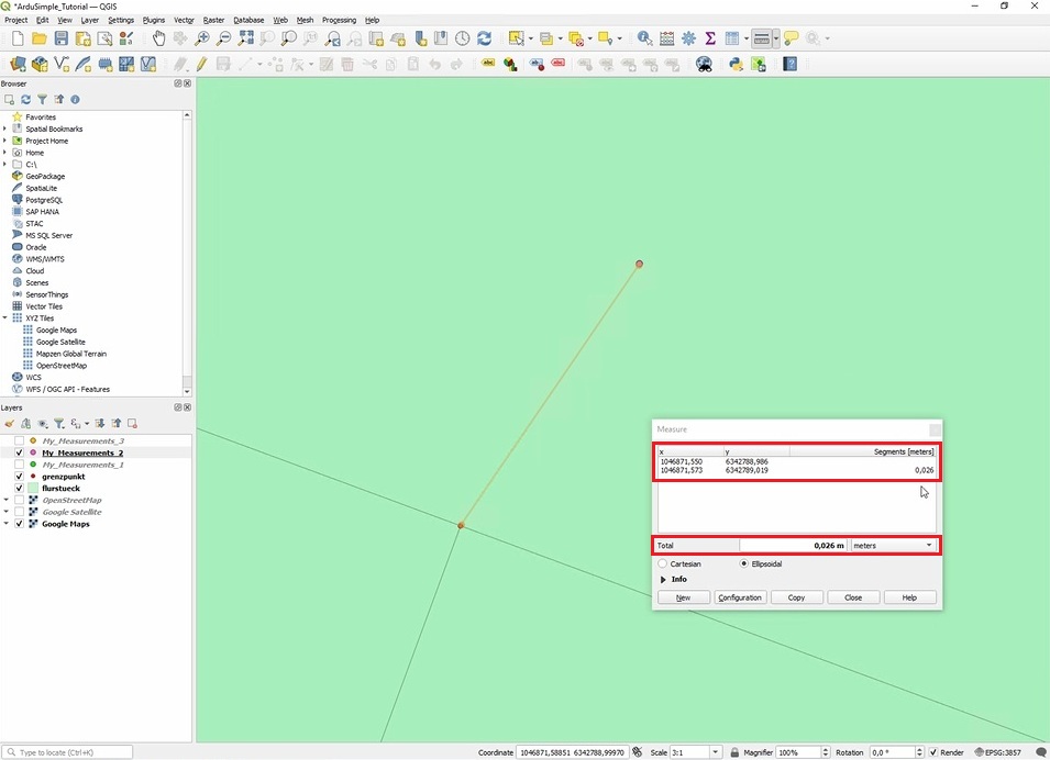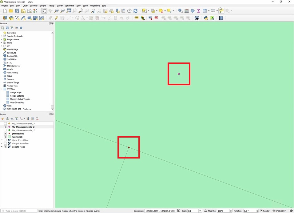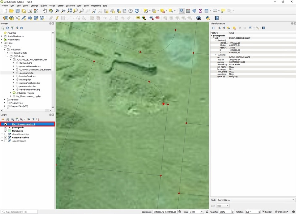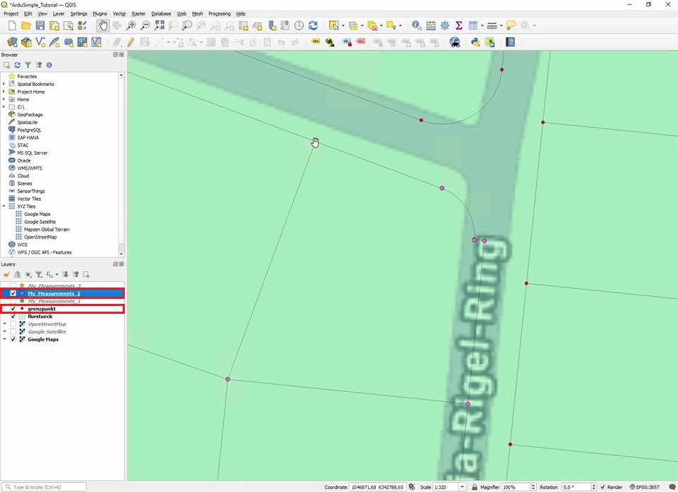 1. To measure the distance between our own measurements and the official points which were downloaded from the cadastral data, make both layers grenzpunkt and My_Measurements visible.