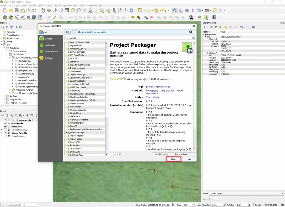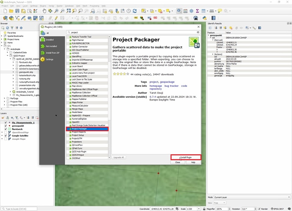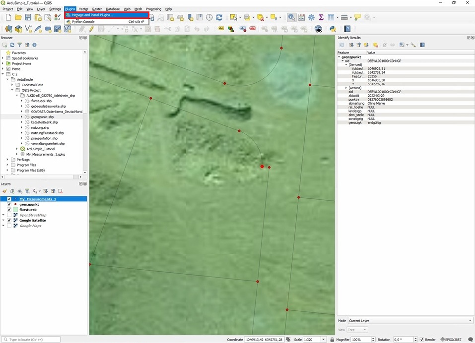 1. So far, we have created a new project in QGIS, added layers for cadastral data and a layer for our own future measurements. The next step will be to do the real GNSS measurements in the field, but before that we have to transfer the QGIS project to a smartphone (or a tablet). There are multiple ways to transfer the project. In this tutorial we will export it as a zip file and transfer it manually. Another smart way is to use QFieldCloud if you want to try out. To manually transfer the file, install a QGIS plugin. Go to the menu Plugins and select Manage and Install Plugins.
